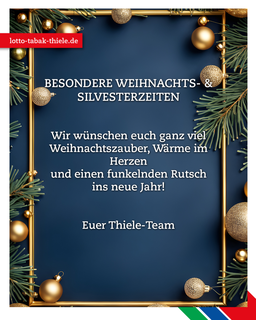 Die Weihnachtszeit steht für Besinnlichkeit, besondere Momente mit der Familie und kleine organisatorische Anpassungen im Alltag. Auch bei Lotto Tabak Thiele ändern sich an den Feiertagen die gewohnten Öffnungszeiten. Damit Sie Ihren Besuch optimal planen können, informieren wir Sie hier übersichtlich über alle Anpassungen an Heiligabend (24. Dezember) und Silvester (31. Dezember).