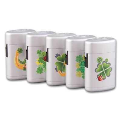 Feuerzeug (25) Jet ATOMIC weiß Lucky Leaf 3D blaue Flamme