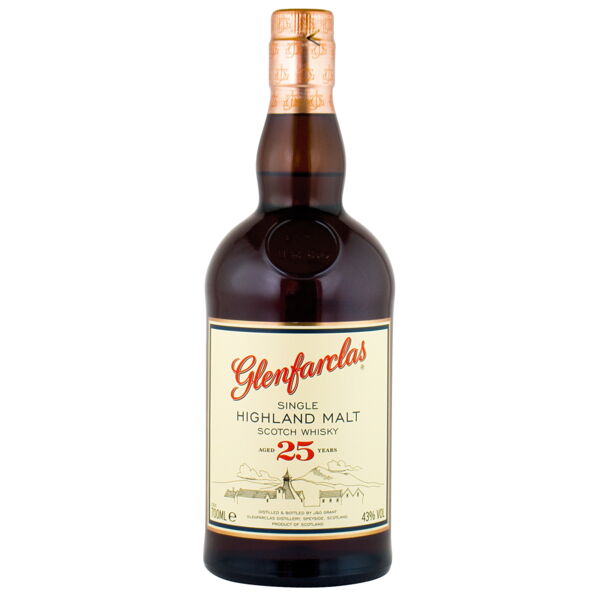 Farbe: Bernstein mit dunkelgoldenen Reflexen. Nase: Komplex, mit verlockenden Aromen von Marmelade, Honig, frisch gemahlenem Kaffee, Sherry und Nüssen. Einige Tannine vom Eichenholz. Geschmack: Vollmundig und robust, der Sherry und die Eiche kämpfen um Ihre Aufmerksamkeit und sind dennoch überwältigend. Finish: Intensiv, lang anhaltend, trocken und malzig. Ein wunderschöner dunkler Schokoladengeschmack am Gaumen rundet den 25-jährigen Glenfarclas ab. Zitat George S. Grant: ""Ein großartiger Whisky nach dem Abendessen, so reich und voll, dass es ein Dessert für sich ist, mit einem Abgang, der für immer andauert."" Hersteller/Inverkehrbringer: The Glenfarclas Distillery, Ballindalloch, Banffshire AB37 9BD, Schottland.