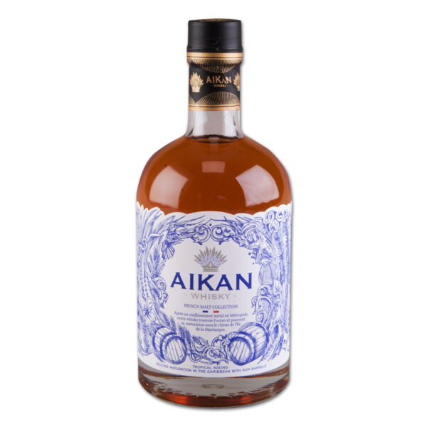 Aikan heißt Hochzeit in der Arawak-Sprache, die Sprache der Ureinwohner der traumhaften Insel Martinique. Aikan Whisky symbolisiert die Vereinigung von zwei Spirituosen-Welten, Rum und Whisky in 2 Klimazonen (Frankreich in Europa und Martinique in Amerika). Zunächst reift Aikin Whisky French Malt Collection Batch No. 1 für 1 Jahr in ausgewählten französischen Eichenfässern in der Bretagne, Frankreich. Danach erfolgt eine zweite Reifephase von 2 Jahren in ehemaligen Rumfässern im tropischen Klima von Martinique, die diesem Aikan Whisky eine einzigartige Konzentration von Aromen beschert sowie seine schöne Bernsteinfarbe. Auch der sogenannte "Angels Share" ist einmalig, fast 10% pro Jahr auf Martinique, im Vergleich zu 1,5% in Frankreich! Reichhaltig und schmackhaft in der Nase, öffnen sich Noten von Orangenblüte, Muskatblüte und intensiver Muskatnuss mit fruchtigen Akzenten von Zitrusfrüchten und Beeren (Brombeere, Erdbeere). Danach stellen sich würzige und herbe Aromen ein, kombiniert mit Quitten, Zitrone und tropischen Früchten (Physalis, Passionsfrucht und Papaya). Intensiv und geschmeidig am Gaumen mit Erinnerungen an die fruchtigen und würzigen Noten in der Nase. Es offenbart sich ein noch schmackhafteres Profil, mit schönen Noten von gerösteten Nüssen und Zimt, alle von Ahornsirup umhüllt. Der Abgang ist langanhaltend und schmackhaft mit Noten von Aprikose, Orangenzeste, roten Beeren, Vanille, Malz und Lebkuchen. Fazit eines internationalen Spirituosen-Experten: Ein echter Single Malt, sehr fruchtig und schmackhaft mit einzigartigen Noten von Gewürzen, Schokolade und interessanten holzigen Noten. Hersteller/Inverkehrbringer: Haromex Development GmbH, Weihersfeld 45, 41379 Brüggen, Deutschland