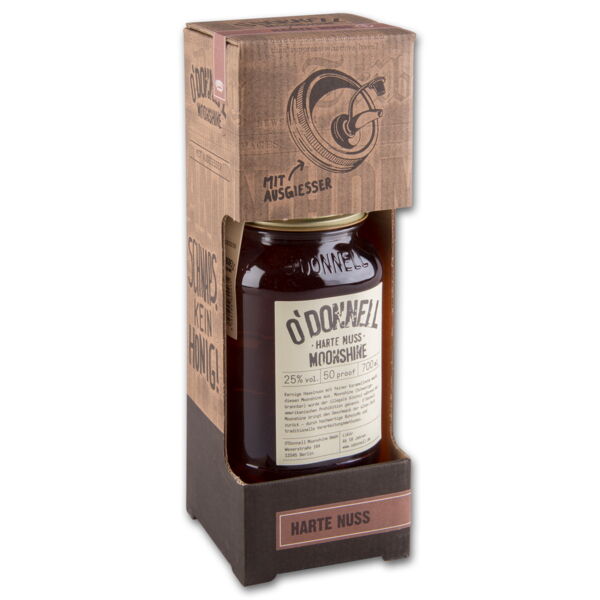 Eine süße Versuchung mit kerniger Haselnuss und feinem Karamell. Die "Harte Nuss" ist eine perfekte Balance zwischen süßen Karamell- und kräftigen Nussnoten, Erinnerungen an vollmundige Nougat & Nusscreme werden geweckt. Die geheime Zutat, um unserer "Harten Nuss" einen besonders runden Geschmack zu verleihen, ist ein Hauch von Whisky. - Hersteller/Inverkehrbringer: O´Donnell Moonshine GmbH, Weserstraße 184, 12045 Berlin, Germany