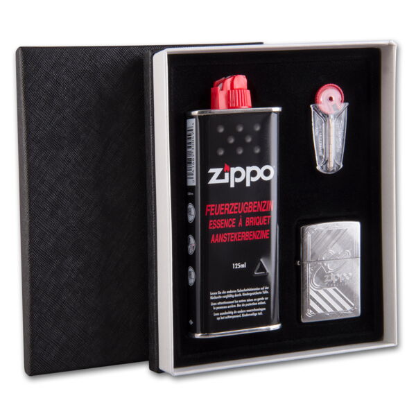 ZIPPO Geschenkbox chrom 80th Anniversary 60002332 mit Steine und Benzi
