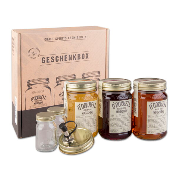 O"Donnell Moonshine Geschenkbox (3x 350ml, 2x Shotglas 5cl & Ausgießer). Harte Nuss, Wilde Beere, Bratapfel - Hersteller/Inverkehrbringer: O´Donnell Moonshine GmbH, Weserstraße 184, 12045 Berlin, Germany