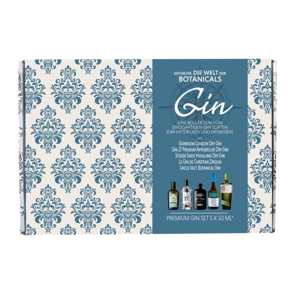 Tastingset bestehend aus den Ginsorten Gunroom London Dry Gin, Studer Swiss Highland Dry Gin, Gin 27, Le Gin de Christian Drouin, Uncle Vals Botanical. Entdecken Sie die Welt der Botanicals! - Hersteller/Inverkehrbringer: Bremer Spirituosen Contor GmbH, Gisela-Müller-Wolff-Str. 7, 28197 Bremen, Deutschland