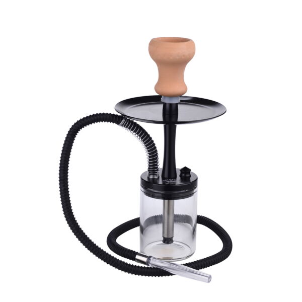 Wasserpfeife von Champ Al Malik mit schwarzer Aluminiumsäule. Eine Keramikschale, ein Schlauch und eine praktische Zange sind im Lieferumfang enthalten. Bestens geeigent für unterwegs aber auch für Zuhause.