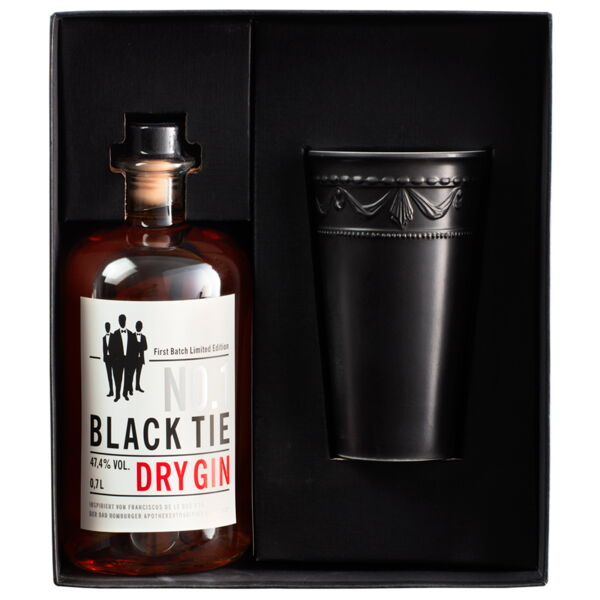 Exclusive Geschenkset bestehend aus einer Flasche Black Tie Dry Gin No. 1 sowie einem Gin Becker aus dem Hause KPM. Der Becher ist Teil der neuen Gentlemen"s Porcelain Serie und ist aus schwarzem Porzellan gefertigt. Die Innenseite ziert das Black Tie Logo.Die Geschichte des Black Tie No. 1 geht auf das 17. Jahrhundert zurück. Nach alter Tradition werden ausschließlich ausgewählte Aromen von Arzneikräutern für die Rezepturen verwendet. Die erlesenen Kompositionen aus feinsten Kräutern, Früchten und Wurzeln verleihen dem No. 1 seine außergewöhnlich weiche Fasson. Süßholz und Zitruszesten rühmen den frischen Geschmack. Gereift mit echtem Wacholderholz, entfaltet der No. 1 sein markantes Wacholderaroma. Die Auswahl hochwertiger Zutaten und eine aufwendige Fertigung in Handarbeit verleihen dem No. 1 seinen ehrlichen Charakter. Durch das Wacholderholz in der Flasche reift der Gin weiter und färbt sich je nach Astlöchern unterschiedlich. Fassungsvermögen des Bechers: 350 ml | Höhe: 13 cm | spülmaschinengeeignet - Hersteller/Inverkehrbringer: Black Tie Collection GmbH & Co. KG, Rockwinkeler Heerstraße 42b, 28355 Bremen, GERMANY