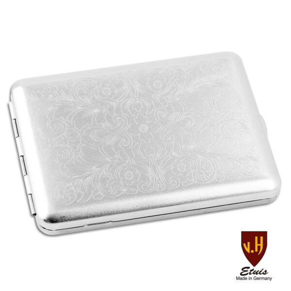 Verabschieden Sie sich von hässlichen Pappschachteln und verstauen Sie Ihre Zigaretten lieber in eleganten Hartschalenetuis in klassisch-schlichtem Design. Bis zu 18 Zigaretten im 100mm Format finden in diesem satinierten Etui mit venetianischer Motivgravur einen sicheren Aufbewahrungsort sicher am Platz gehalten von dem integrierten Gummizug.