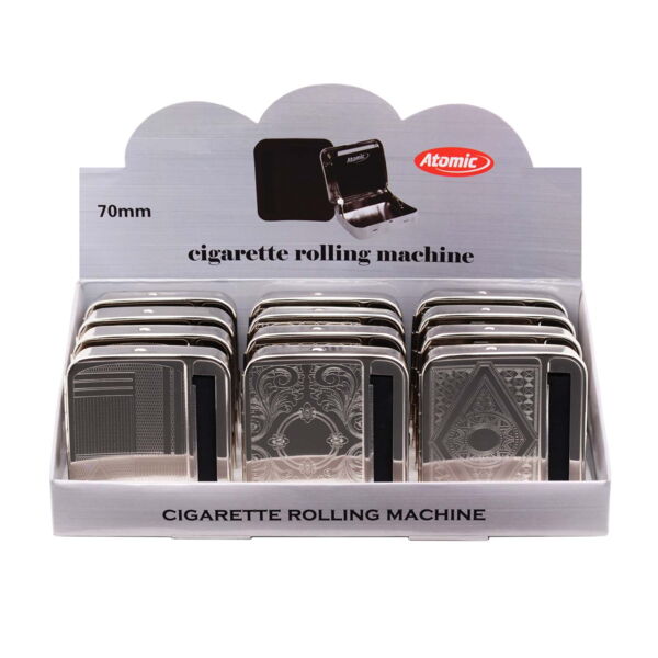Diese Rollboxen von ATOMIC sind aus Metall und vom Deckelmuster 4-fach sortiert (12er Gebinde). Sie sind handlich und praktisch, da im Zigarettenwickler Platz für Tabak und Blättchen ist.