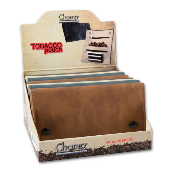 Kunstleder-Feinschnitttaschen von Champ. Farblich sortiert im Display à 12 Stück.