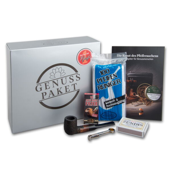 Pfeifenraucher Starter-Set im praktischen Koffer, Inhalt: 1 x Pfeife (Bruyèreholz, 9mm-Filter-Bohrung), 100 x Pfeifenreiniger, 1 x Pfeifenbesteck (Stopfer, Dorn und Auskratzer), 1 Packung Pfeifenhölzer, 10 x Kohlefilter