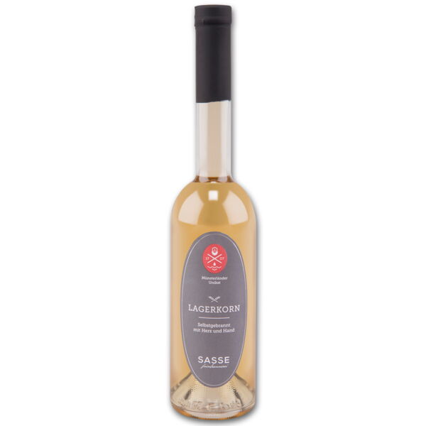 Ein Dreiklang aus einer besonderen Malz Getreide Kombination, gepaart mit der "Genialen Becker" Destillation, sowie der mindestens vier jährigen Reife in edlen Barriques, in denen vorher Cognac reifte, machen ihn so besonders. Für die Vermählung werden bis zu 50 Barriques aus drei verschiedenen Alterskategorien verkostet. So wird ihm seine komplexe und elegante Struktur verliehen. Auf einer Feier des örtlichen Nikolausvereins tauchte eine uralte Flasche Sassekorn auf. Dieser Kornband war von Urgroßvater Sasse mit einem besonderen Dreiklang gemacht worden. Alte Getreidesorten, ein "genialer Becker" und ein eine Sorgfältiger Ausbau begeisterte die anwesenden Männer mit einem vielschichtigen Geschmack. Der Abend war gerettet und die Lagerkorn-Idee geboren. Eine Dekade lang dauerte die Entwicklung des Verfahrens, das die Qualität und den Geschmack von Lagerkorn nachhaltig garantiert. Heute ist der edle Tropfen aus der Feinbrennerei Sasse ein echtes Münsterländer Unikat. Lagerkorn ist sehr weich, warm und elegant. Beherrschend sind helle Aromen, wie Vanille und weiße Schokolade die sich mit einer süß-malzigen Stilistik kombinieren. Es finden sich die herrliche- würzigen Röstaromen des Malzes wieder, die vollständig erhalten sind. - Hersteller/Inverkehrbringer: Lagerkorn GmbH, Düsseldorfer Straße 20, 48624 Schöppingen, Deutschland