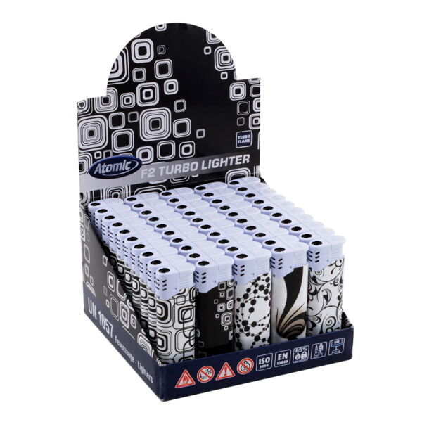 Einwegfeuerzeug Turbo ATOMIC Black & White sort Steller mit 50 Stück