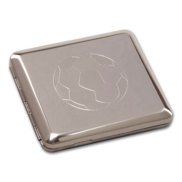 Zigarettenetui Metall 18er KS Nickel poliert Fußball-Gravur Gummizug