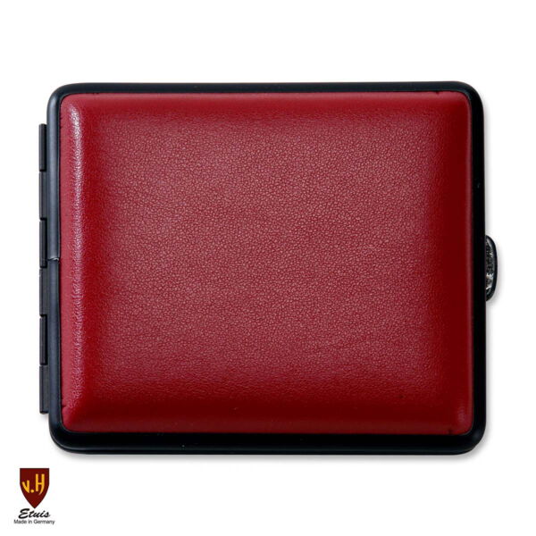 Ansprechendes Hartschalenetui mit schwarzer Einfassung und weinrotem Kunstlederüberzug. Das schlichte und elegante Etui mit Gummizug bietet Raum für 18 King Size Zigaretten oder Cigarillos.