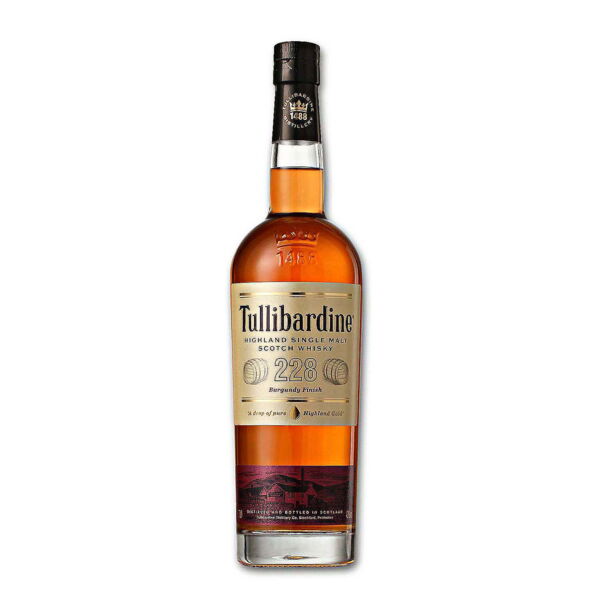 Der Tullibardine 228 Burgundy Finish wurde nach den 228 Liter Burgundyfässern aus dem Chateau de Cassagne Montrachet benannt, die ihm seine rubinrote Farbe verleihen. Grundlage dieses Whiskys ist der Sovereign, der durch die Lagerung Noten von Milchschokolade, Vanille und frischen Erdbeeren annimmt. Mit dem sahnigen Mundgefühl erweckt der Tullibardine den Eindruck, man nehme Erdbeeren mit Schlagsahne zu sich. Ein wahrer Gaumenschmaus. Hersteller/Inverkehrbrinber: Tullibardine Ltd., Stirling Street Blackford Perthshire, PH41QG, Schottland