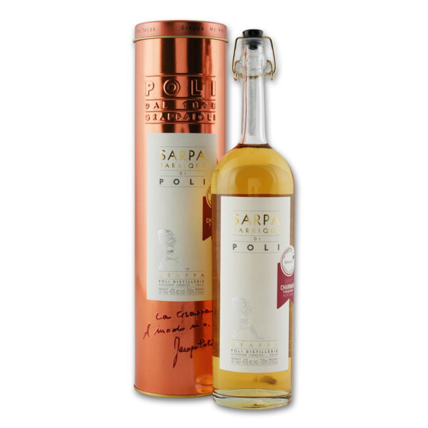 Italien - 40% Vol. Inhalt: 0,7 Liter - Ein Grappa der Spitzenklasse ist der Sarpa Barrique aus der Familien-Destillerie Poli, die seit über 100 Jahren exzellente Grappas aus besten, regionalen Zutaten brennt. Der aus Merlot und Cabernet Sauvignon (im Verhältnis 3/2) hergestellte Sarpa Barrique ist von bezaubernder goldener Farbe und verströmt einen betörenden Duft nach mediterranen Früchten, Lakritz und Vanille, die sich zusammen mit einer Spur Kaffeearoma im lange anhaltenden, warmen Geschmack wiederfinden. - Hersteller/Inverkehrbringer: Poli, IT-36060 Schiavon